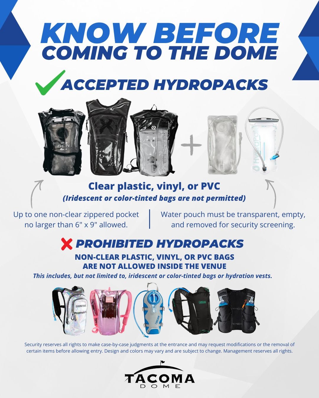 All items listed below are in addition to the Tacoma Dome's general prohibited items, available on our A-Z guide.